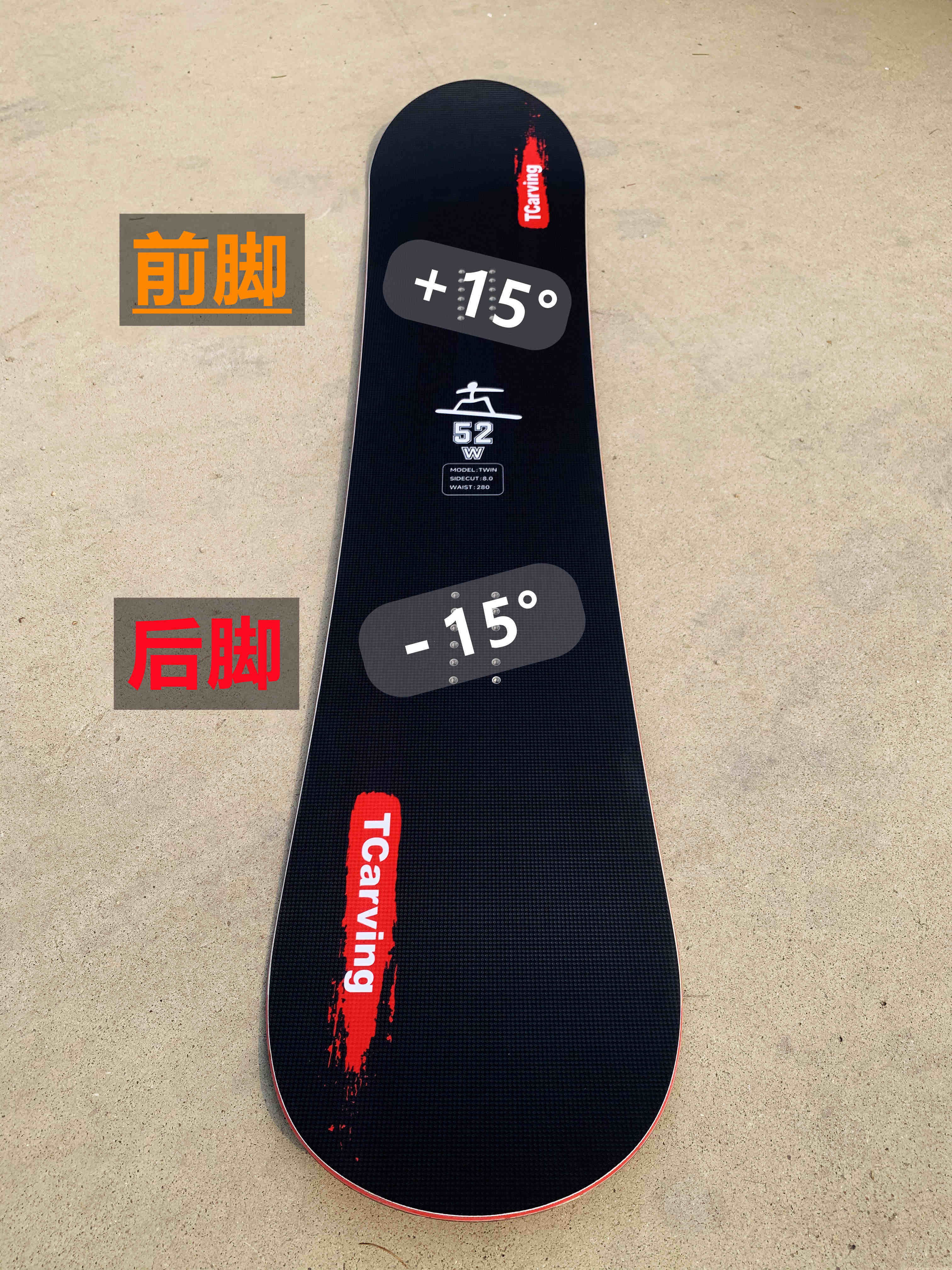 2. 八字刻滑 二 +15°-12° (加大跨距)因为加大了跨距,后脚调整成-12°这样后腿膝盖压力会小些,